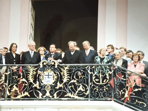 17時の鐘が鳴る5分前にピタリと雨はやんだ。ファンファーレのなか、旧市庁舎バルコニーには、連邦大統領、両院議長、首相、連邦憲法裁判所長官、州政府首相、ボン市長らが勢ぞろいした。市民が拍手で迎える。日本で「三権の長」が揃って並ぶのは、天皇の前だけで、市民の前に最高裁長官を含めて勢ぞろいすることはまずない。ティールゼ連邦議会議長は東ベルリン出身だが、彼は「ボンなくしてベルリンはない。ボンを引き継ごう」と呼びかけ、大きな拍手を浴びた。シュレーダー首相の挨拶の時だけ野次が飛んだ。サミットなど対外政策面ではご機嫌だったが、財政改革や保健・年金改革など、内政問題では針のむしろの日々が続く。連邦憲法裁判所のリンバッハ長官だけは紹介のみで、挨拶はなし。連邦憲法裁判所はいまも、これからもカールスルーエが所在地。