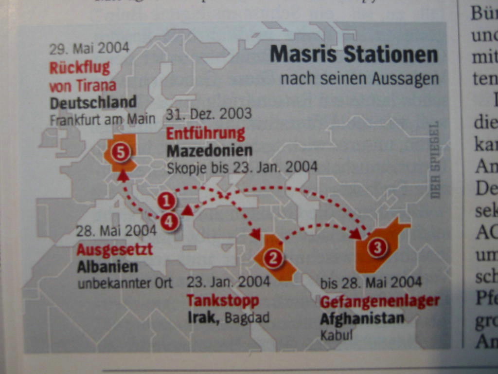 2003年12月、マケドニア共和国の首都スコピエで、ドイツ市民のマスリ氏がCIAに拉致され、飛行機でアフガンの米軍収容所に送られた。『シュピーゲル』誌は施設の様子を詳細に伝えた。そこで暴行を受け、4カ月後に解放され、アルバニアの町の路上に放置されたところを発見された。マスリ氏とアルカイダとの関係は証明されなかった。スコピエからの移送は、CIAがチャーターしたボーイング737型機が使われたことは、航空日誌などから明らかにされている。マスリ拉致事件は、ドイツにとっては、CIAの飛行機が空港を使用したというレヴェルにとどまらない。ドイツ国籍をもつ人が白昼公然と拉致され、拷問を受けたのである。米国ブッシュ政権のやり方に対するドイツ人の不信感、不快感はかつてなく高まっている。さらにイタリアでも、アルカイダの容疑者とされた人物が、白昼、ミラノ市内で拉致された。車でイタリアの米空軍基地に運ばれ、そこからエジプトに移送されたという。ヨーロッパの米空軍基地、拷問を普通に行う国々への移送。このダーティな構図がヨーロッパの不快感を高めている。