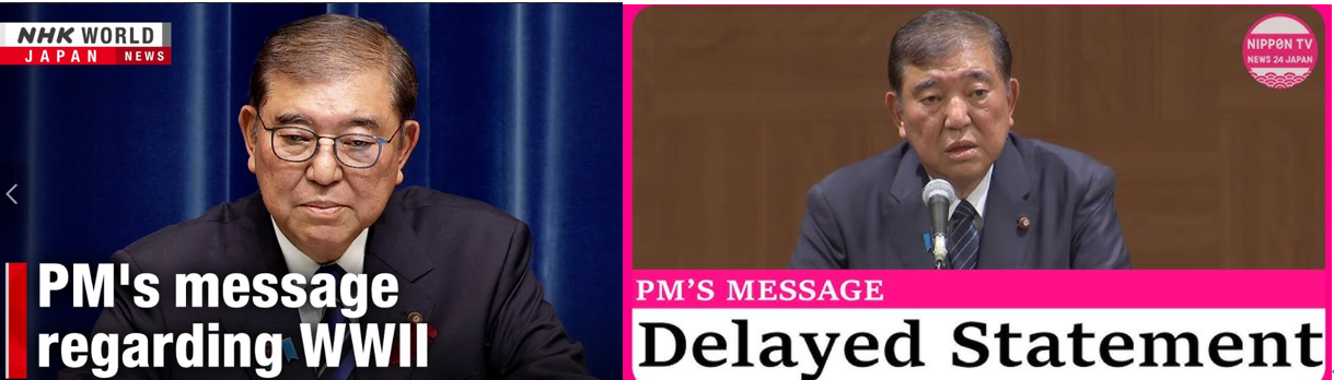 実は、ここからが本論なのである。重要な節目となる「戦後80年」の年、2025年がまもなく終わる。石破茂には、8月15日に閣議決定を経た「内閣総理大臣談話」を期待したのだが、党内力学もあって決断できなかった(直言「「安倍談話」克服へのわずかな半歩―「戦後80年談話」は見送られたが」参照)。石破政権発足1周年にあたる10月1日に首相見解が出ると想定して、9月12日の直言「トランプ暴風の前に政治空白を生むな」の3つ目の小見出しの副題に入れて待っていたが、自民党総裁選の最中ということもあってか、断念したようである。そして、ようやく10月10日18時、内閣総理大臣所感「戦後80年に寄せて」(以下、「石破所感」という)が発出された(全文は官邸サイトから)。冒頭の写真は、日テレNews24 English10月10日のものである。「遅延した声明」という見出しがついた。ただ、その2時間半前に公明党の政権離脱が明らかになったので、新総裁の高市早苗にとっては「泣きっ面に蜂」というところだろうか。