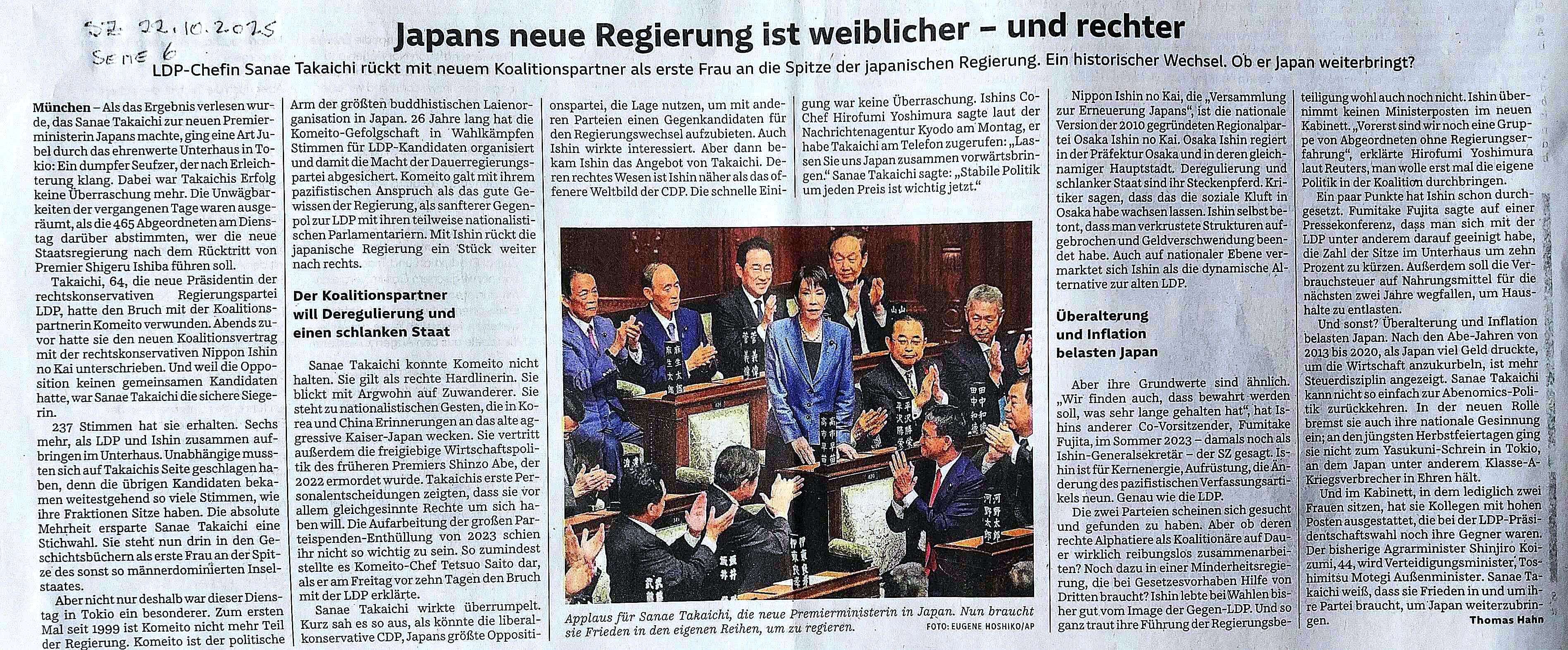 ベルリンの『ターゲスシュピーゲル』10月21日は、「右翼の維新との連立」で「右シフト」を明確に指摘している。Deutsche Welleは高市を「保守強硬派」、国家主義的、対中強硬派、歴史修正主義者として位置づけられている(21.10.2025)。夫婦別姓や女性天皇に反対する姿勢から、「改革なき進歩の象徴」とも(同)。