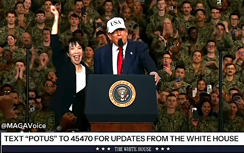 第3に、空母ジョージ・ワシントン艦上での高市の振る舞いについてである。多くの米兵の前で、右手の親指を立て「サムズアップ」をして、子どものようにぴょんぴょん飛び跳ねてはしゃぐ姿は、むしろ痛々しかった。この姿をいろいろ論評した人たちに対して、ネット上では非難する声が大きい。私は、それよりも何よりも、軍事介入の主要な手段となる現役の原子力空母に乗艦して、「力による平和」(Peace Through Strength)というプレートが足元や背後の壁に掲げられているところで、トランプにぴったり「寄り添う」姿を全世界に見られてしまったことの方が重大だと考えている。日本は「力による平和」に対して距離をとり、「専守防衛」というよくできた屁理屈を使って「平和国家」のブランドを活かしてきたのではなかったか(自衛隊のイラク派兵でさえ「復興支援」だった)。米空母上での高市のパフォーマンスのマイナス効果ははかり知れない。