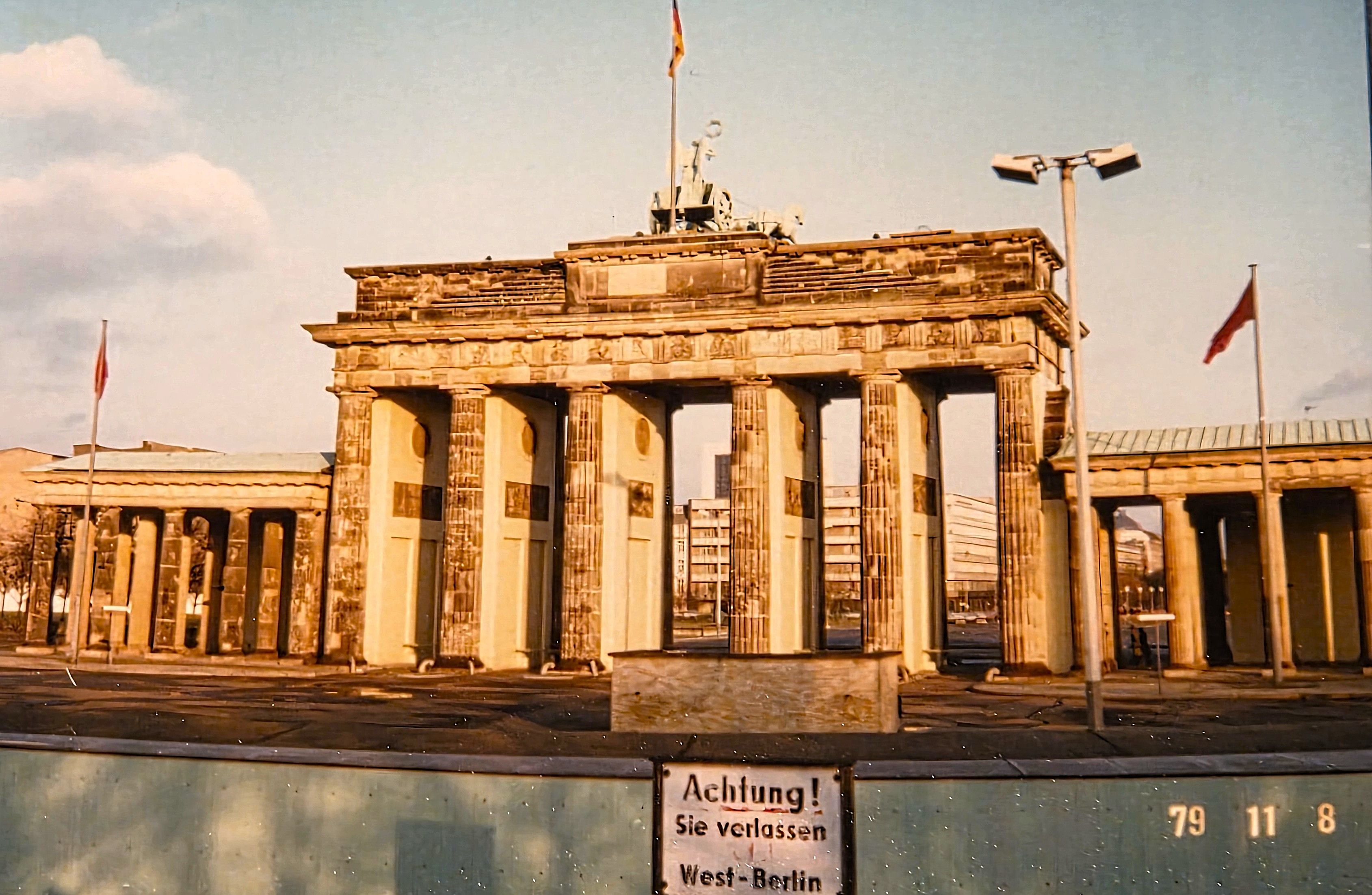私がベルリンを訪れるのは7回目である。冷戦時代にも2回、ベルリンを訪れている。最初は1979年11月だった。この写真はブランデンブルク門を東側と西側から撮影したもので、門は東側にあったことがわかる。「注意!あなたは西ベルリンを離れる」という表示は、西側に設置されていた「お立ち台」(東側に1メートルほどせりだしている)から下に落ちると、東側に拘束されるという警告である。足が震えたのを覚えている。