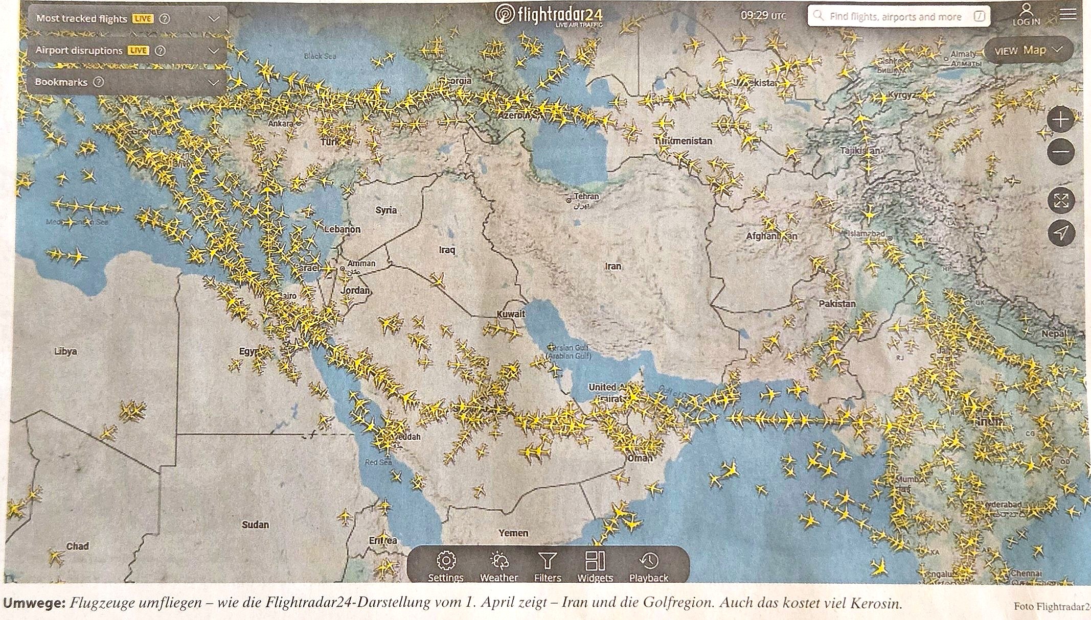先回りするが、帰りのNH218便について。中東の国々を経由して、中国を通って羽田まで飛ぶコースだった。乗り継ぎ便のミュンヘン空港でANAのサービスでもらった『フランクフルター・アルゲマイネ』紙の28面に、偶然だが、私たちが乗る前日、4月1日の飛行地図が掲載されていた(冒頭の写真参照)。タイトルは「航空業界は燃料が不足しつつある」で、戦争の結果燃料費が2倍以上になり、しかもイラン上空を迂回することによって多くの燃料が余計にかかると書いている。この北側の迂回路を私たちが搭乗したANAのNH218便も飛んだわけである(フライトマップ参照)。