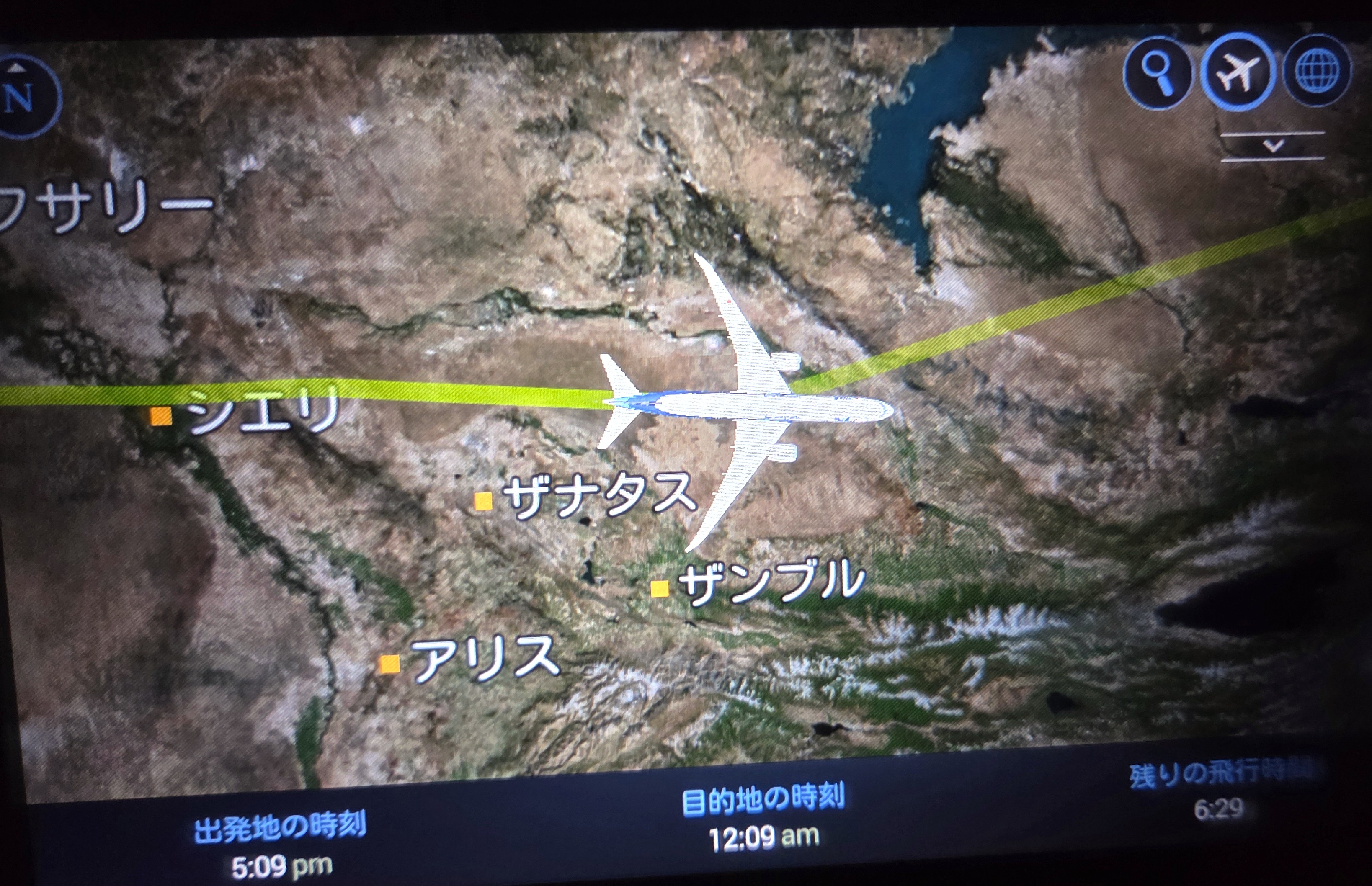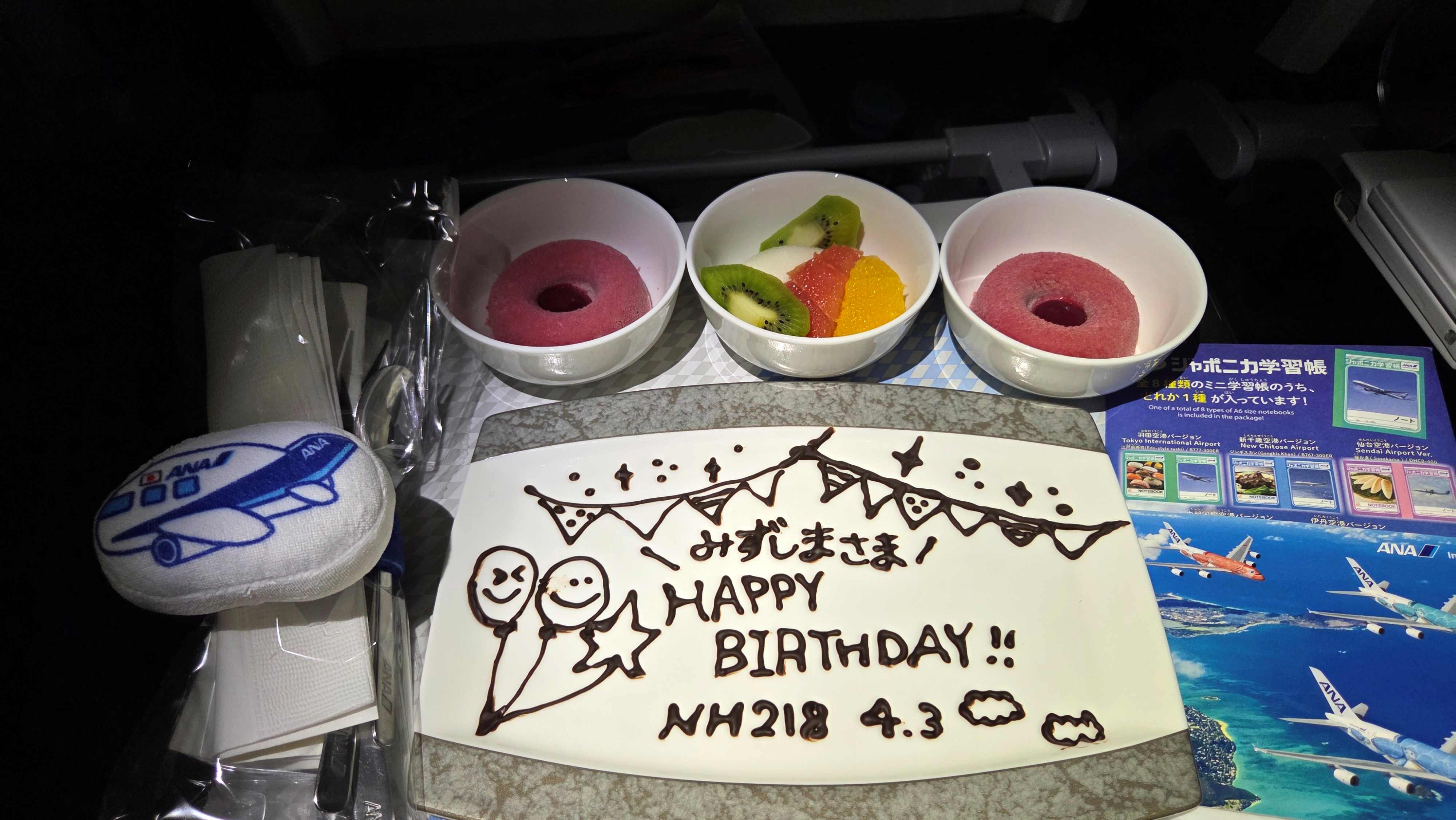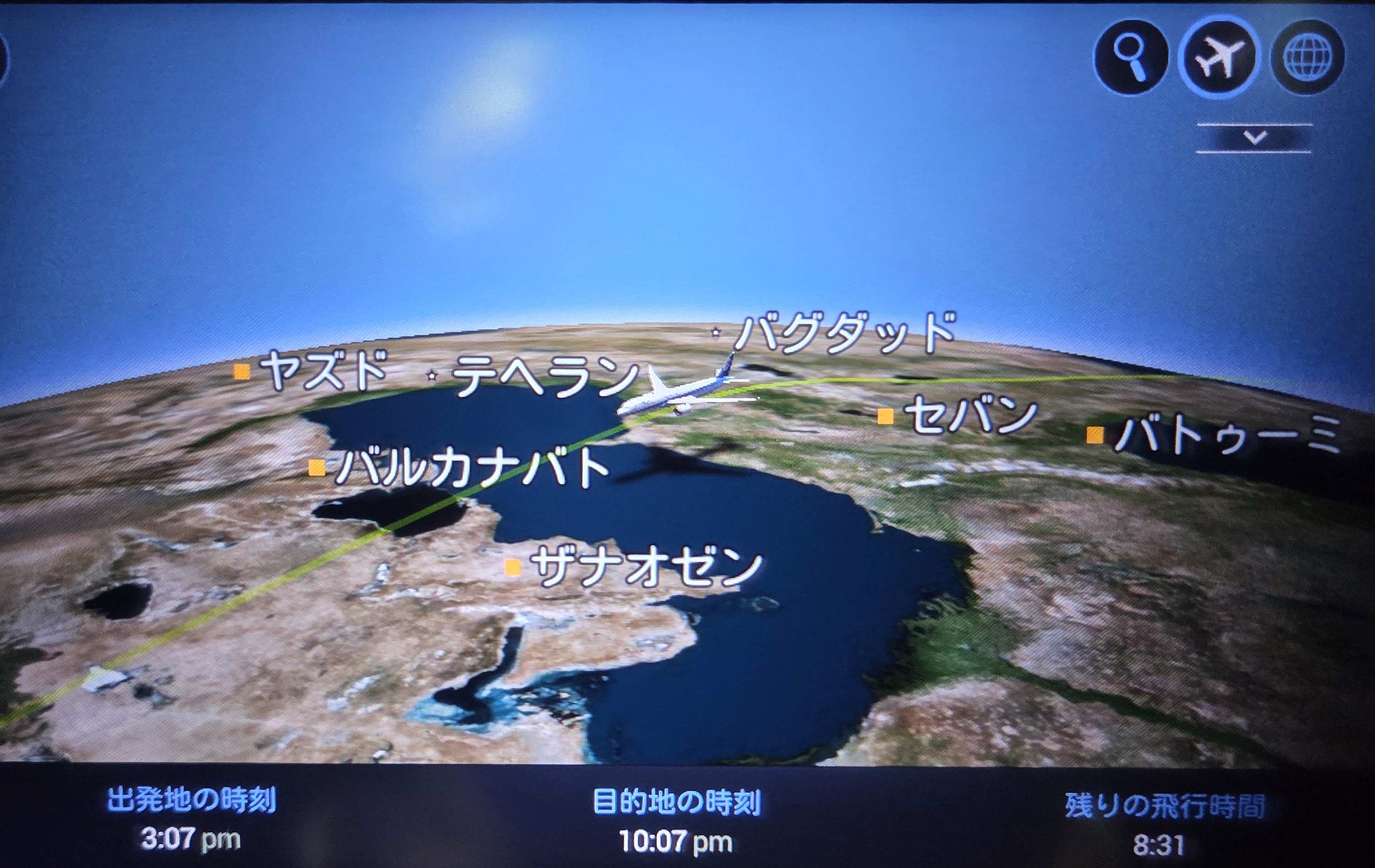 なお、個人的なことだが、帰りの便の飛行中に4月3日となった。私の誕生日である。客室乗務員との会話でさりげなく話していたのだが、何と、4月3日午前零時になると、3人の客室乗務員が手作りのケーキプレートを座席にもってきて祝ってくれた。ちょうどフライトマップを撮影しようとスマホのカメラを構えたところだった。エコノミークラスの乗客にもあたたかい配慮をしてくれたNH218便の客室乗務員の方々に感謝したい。急いで撮影したのが、午前12時9分の数字が入っているフライトマップである。カザフスタン共和国ザンブル州の上空だった。