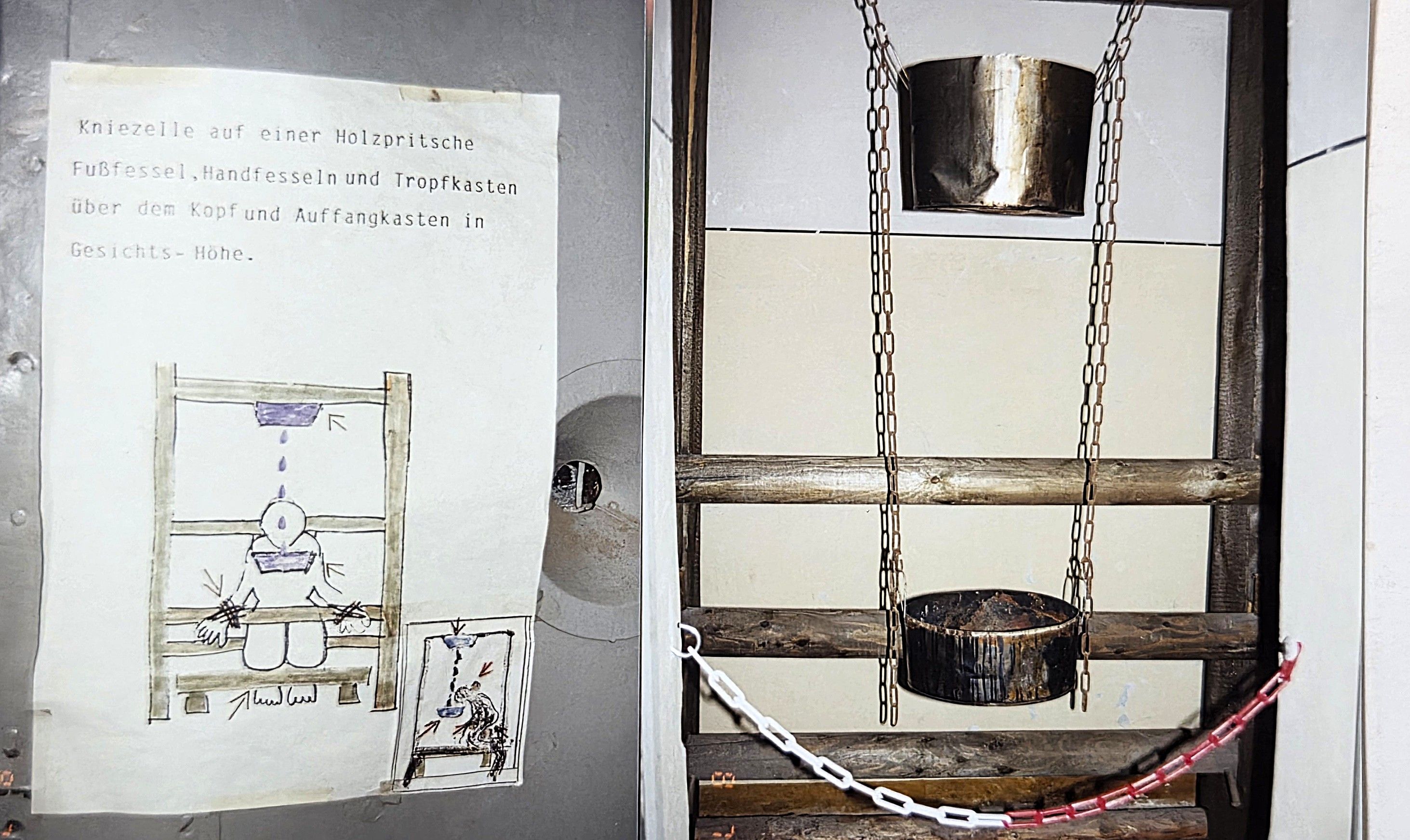 「ここは、1945年以降、旧ソ連秘密警察の第3特別収容所(Speziallager)だった。20000人以上が拘禁され、3000人がここで死んだ。ナチ党員だけでなく、ソ連占領軍の「敵対分子」とされた人々も多数含まれていた。旧ソ連刑法58条(反革命罪!)も適用されたので、共産党との「合併」(社会主義統一党[SED]の結成)に反対した社民党幹部や、冤罪を主張した牧師までが拘禁された。その後、シュタージの未決勾留施設となったが、その本質は拘置所や行刑施設(刑務所)などではなく、「政治司法」の施設だった。「ゴム暗黒独房」(Gummi-Dunkelzelle)や「Uボート」という窓なし独房を見ればそれは明らかだ。前者はラジオスタジオのような構造で音を完全に遮断。光も入らない。後者は一種の水牢。寒い暗闇のなかで注水された。精神障害を起こした人もいたという。「鳥かご」(Käfigen)という野外独房にも入った。人間を精神的にいためつけるサディスティックな工夫が随所に見られ、吐き気を覚えるほどだ。…」