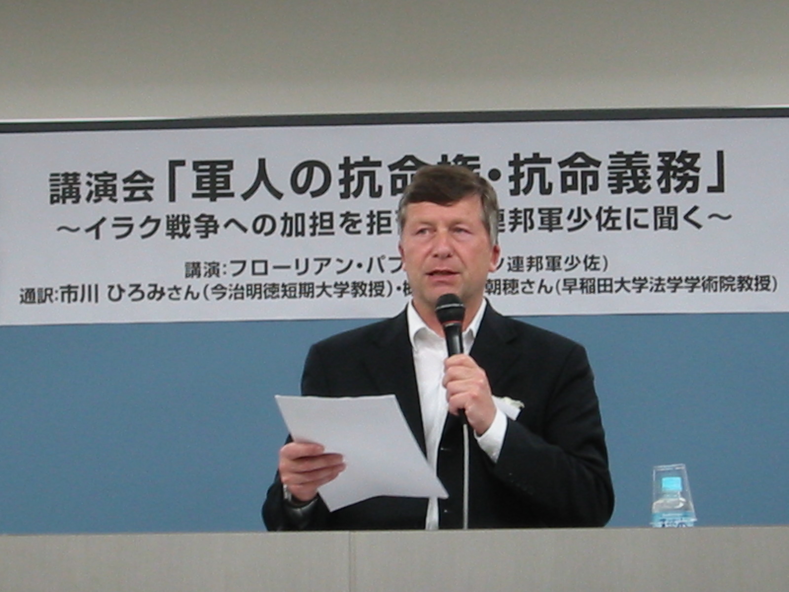 おかしいことは多くの人がわかっていても、「空気」にまけてしまい、ノーということができないことである。「やましき沈黙」がまた繰り返されるのか。直言「ドイツ軍少佐からの白バラ ― 軍人の抗命権・抗命義務」でも書いたように、私は17年前、国際法違反のイラク戦争を開始した米国にドイツ連邦軍が協力する命令を拒否した少佐の話を紹介している(上の写真はその時の講演会)。今回の「イラン戦争」でも、米軍パイロットがイスラエルへのミサイル輸送を拒否するという映像が、公聴会らしき場所で声をあげて拘束される女性軍人(空軍ではない)の姿とともにSNSに流れているが、まだメディアでは報道されていない。