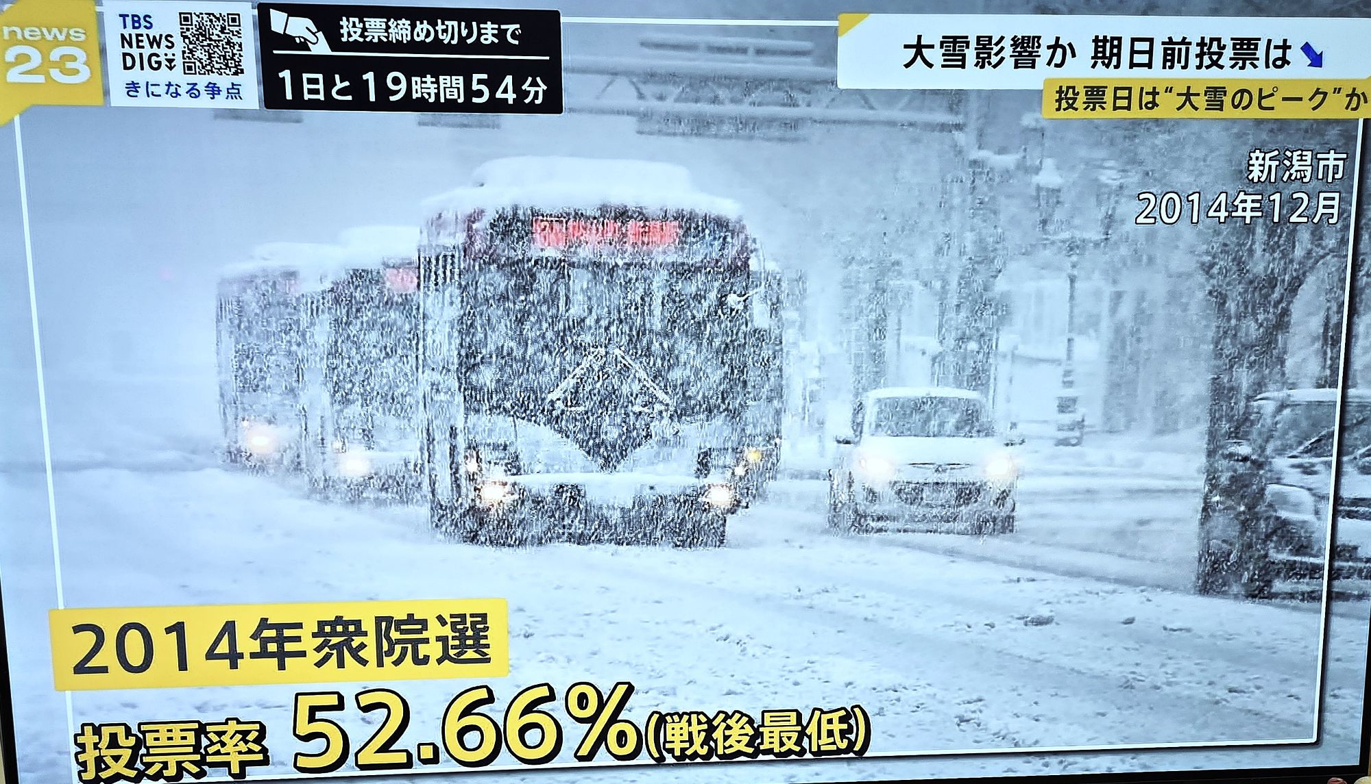 ここで想起されるのが、安倍晋三による2017年の「国難突破解散」である。このときの総選挙は、台風21号の接近と重なった。選挙期間中から「伊勢湾台風クラスの超大型台風」という表現が繰り返し報じられ、有権者の間に強い警戒感が刷り込まれていった。投票日当日、暴風雨のなかで「不要不急の外出を控えるように」という呼びかけと、投票時間終了のカウントダウンが同時に流れるという異様な光景が現出した。結果として投票率は53.68%と低迷し、与党に有利な環境が生まれた。悪天候が投票率を押し下げ、その効果が組織力を持つ与党に有利に働く――この構図は、すでに実証されていたといえる。