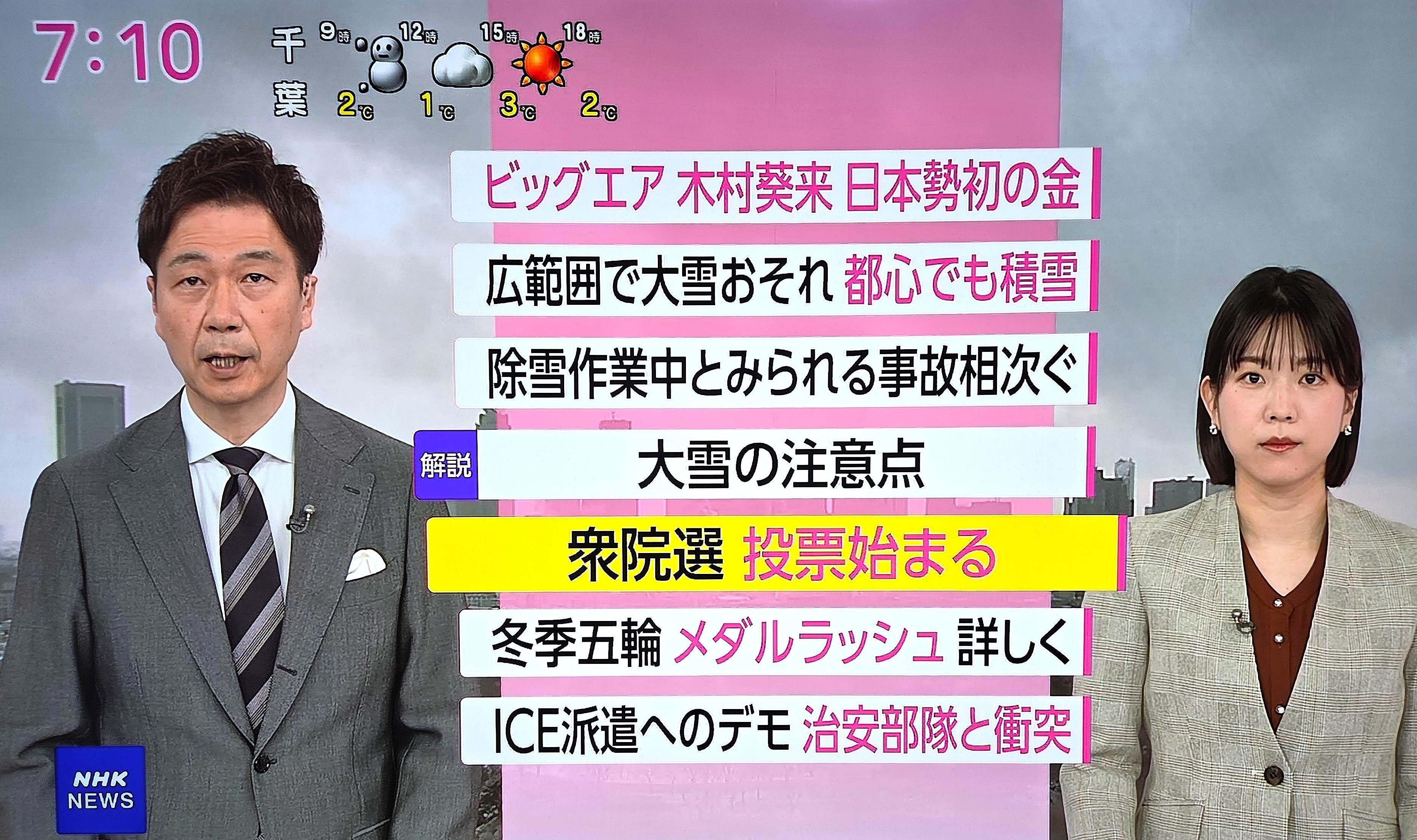 投票日当日である2月8日、午前7時のNHKニュースは、その象徴的な場面を映し出していた(写真参照)。ニュース冒頭で伝えられたのは、日本選手による冬季五輪での金メダル獲得だった。「今日は衆議院総選挙の投票日です」という言葉は、そこにはなかった。金メダルのニュースに続いて、大雪に関する注意喚起が丁寧に行われ、その後になってようやく「衆院選の投票が始まりました」と告げられた。ニュース開始から10分20秒後のことである。