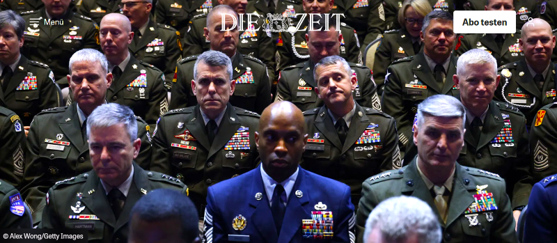 昨年9月30日、ヘグセスは米軍の高級幹部(将官)を数百人、全世界から一斉にバージニア州の海兵隊基地に集めた(写真は国防総省のHPより)。そもそも司令官クラスの将官全員を、明確な理由も示さずに一斉に招集すること自体異例とされ、軍の運用上も問題があるが、そこでヘグセスが行った演説も異様なものだった。トランプ政権が行ってきた4人の女性の将官解任や黒人のブラウン統合参謀本部議長の解任を擁護し、「肥満の将軍や提督」「ひげを生やすような連中もいらない」として、ジェンダーなどを考慮する「DEI」(多様性・公平性・包摂性)の行き過ぎが米軍にあったと主張するものだった。そして、軍人に「最高の男性基準」を求めた(以下『朝日新聞』2025年10月1日)。トランプも登壇し、1時間を超える大演説を行った。「我々は外敵と変わらない、内側からの(敵による)侵略にさらされている」と主張。サンフランシスコやシカゴなど民主党が強い都市を挙げ、「極左の民主党員に支配されている都市は治安が非常に悪い」と述べるなど、党派色・政治性むき出しの主張を一方的に展開した。性や人種、外見を侮蔑する発言も壇上から激しく行った。将軍たちは複雑な表情でこれを聞いていた。