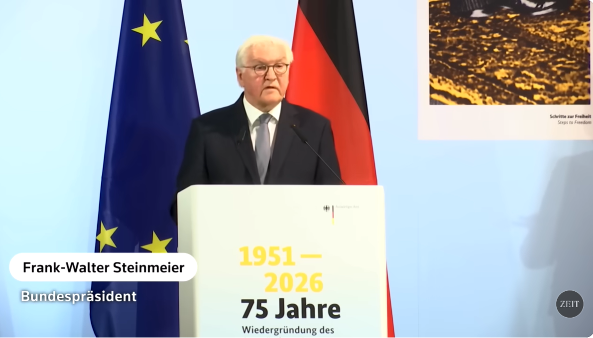 75周年記念式典」に参列した連邦大統領フランク=ヴァルター・シュタインマイヤーは、基調演説のなかで明確にイラン戦争について「国際法違反」と断定したのである(写真はDie Zeit vom 24.3より)。連邦政府は「全面支持とはいわないが、国際法違反ともいわない」という外交的に曖昧な線を貫いていたが、大統領が公然と国際法違反といったので注目された。ちなみに、私が知ったのは ドイツ到着後のことで、スマホで、定期購読している『南ドイツ新聞』を読んで驚いた。
