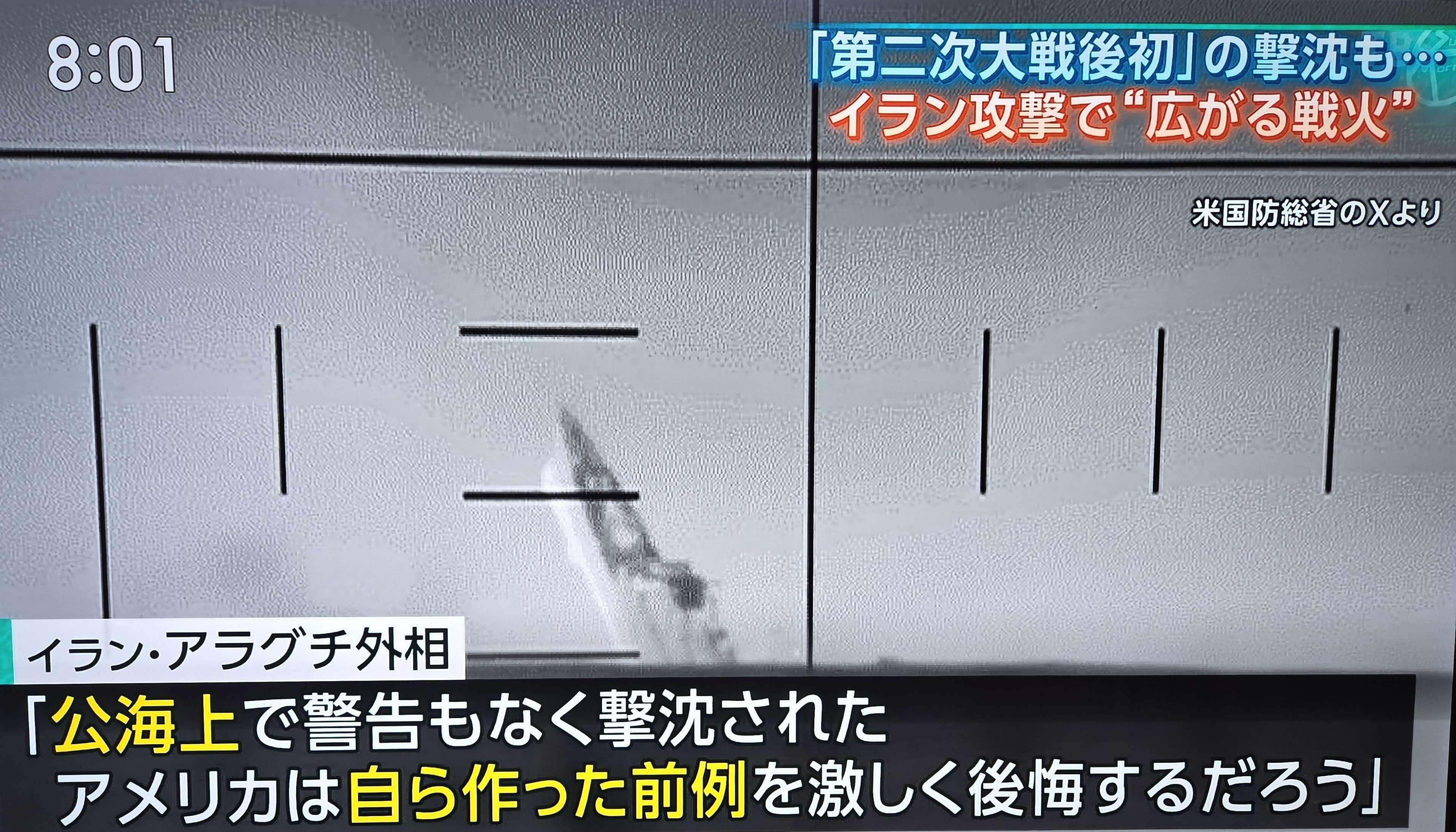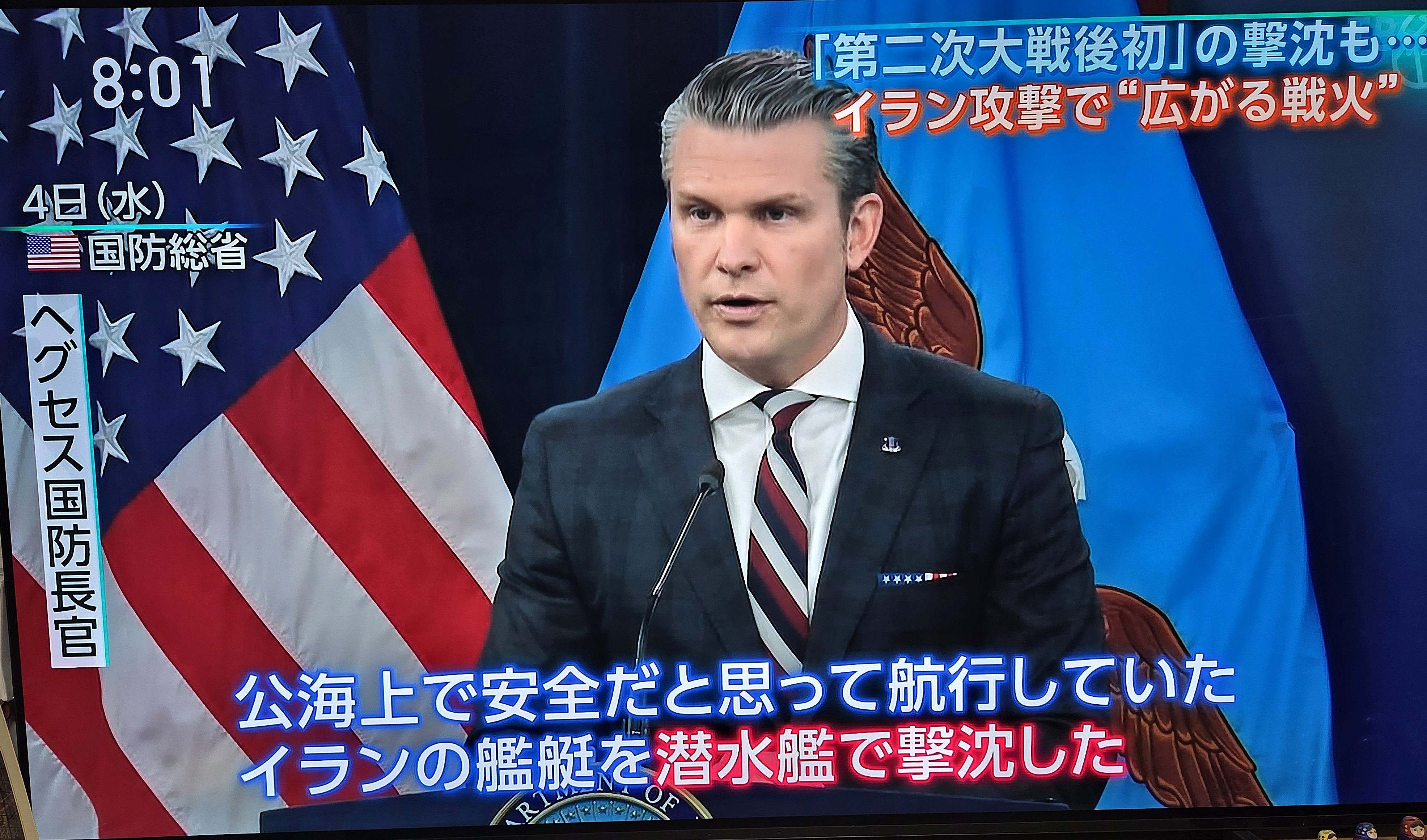 国防長官ピート・ヘグセスは4日の記者会見で、これは「第二次世界大戦以来、魚雷による敵艦の最初の撃沈」であると胸を張った(写真はサンデーモーニング3月8日)。「最初」というのは誤りで、記憶に新しいものとして、1982