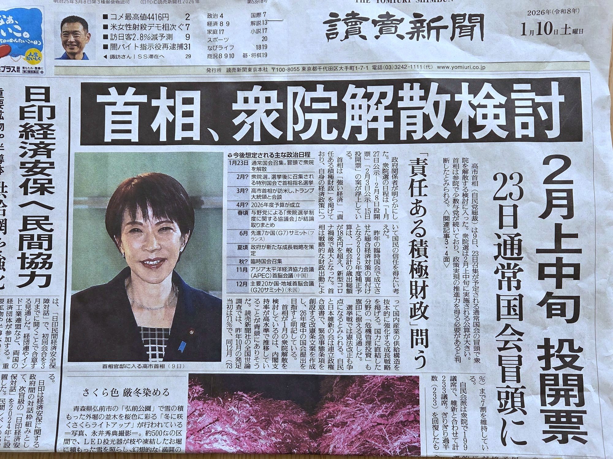 発端は、『読売新聞』1月10日付(右の写真参照)の報道だった。通常国会召集を目前にして突如として解散観測が報じられ、永田町に解散風が吹き荒れた。通常国会冒頭での解散は、1966年以来60年ぶりという異例の事態である。安倍晋三による「国難突破解散」が臨時国会の冒頭(9月)だったことと比べても、その異常さは際立つ。