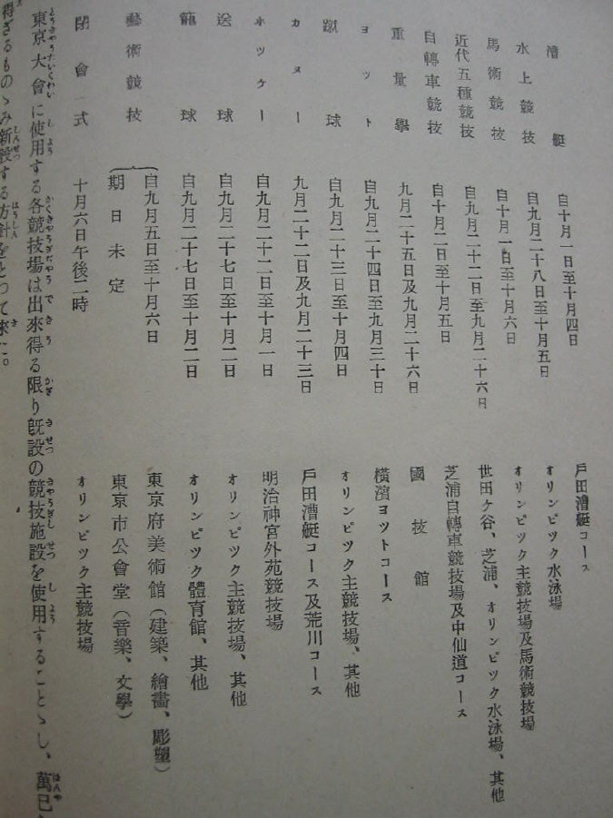 競技種目や具体的な計画も詳しく書かれていて、実にリアルである(43~51頁)。国際五輪委員会が決めた正式種目は陸上、馬術、体操など14種目、選択種目からサッカー、水球、ホッケーなど6種目、番外競技として武道(剣道、柔道等)と野球が採用され、計22種目が計画されていた。9月21日午後3時から開会式、10月6日(日)午後2時から閉会式である。選手たちが翌日の競技に支障をきたすような、深夜に及ぶ無理な開会式にはしていない。