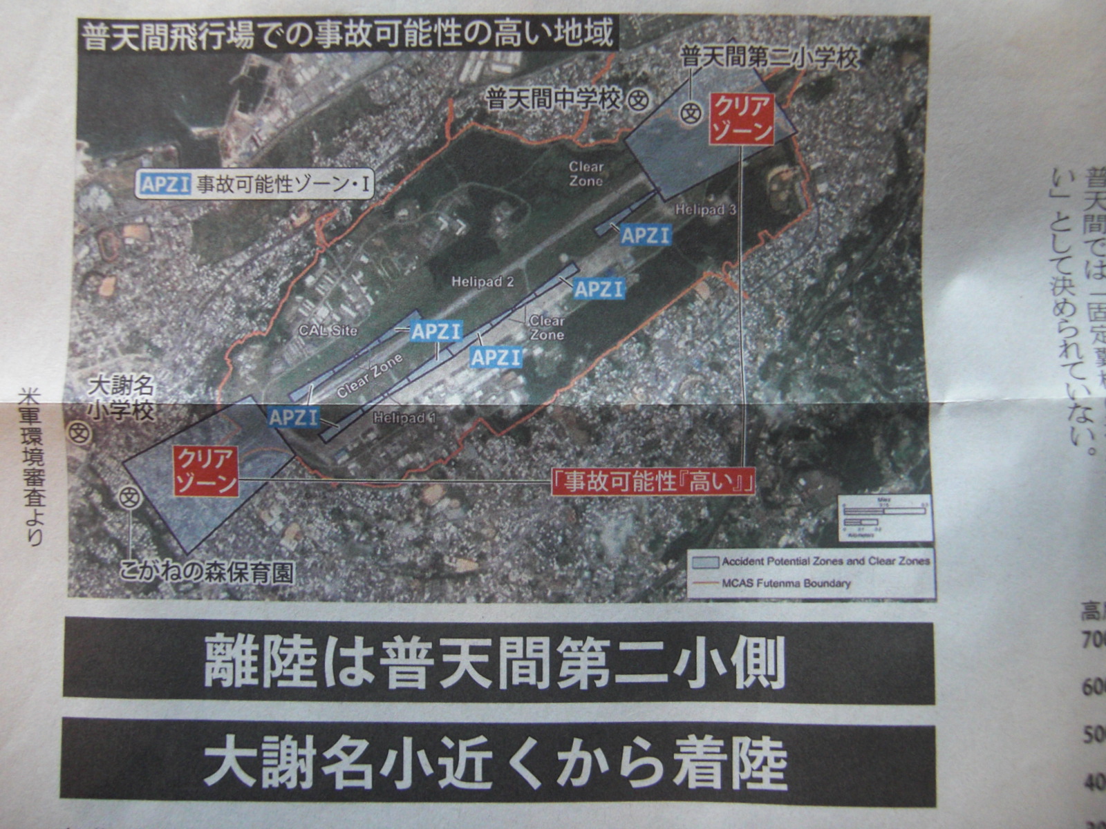 「速報」の記述によれば、米側が提出した環境審査のデータには、オスプレイの飛行経路図9枚が含まれていた。いずれも、普天間第二小学校がある滑走路北側から離陸し、大謝名小学校に近い滑走路南側から着陸する経路になっている(→写真参照)。経路図によると、浦添総合病院上空で高度150メートルになり、宜野湾市大謝名小学校上空で高度60メートルになる。その間、着陸のため、回転翼の向きを進行方向から上向きに変える操作を行う。この時がオスプレイの一番不安定な瞬間となる。真下に学校や病院がある。オスプレイの事故実績と重ねて、県民・市民のオスプレイ拒否感覚は質的に変化したと言えよう。政治や安全保障の問題ではなく、命と生活を守る問題になったという意味において。