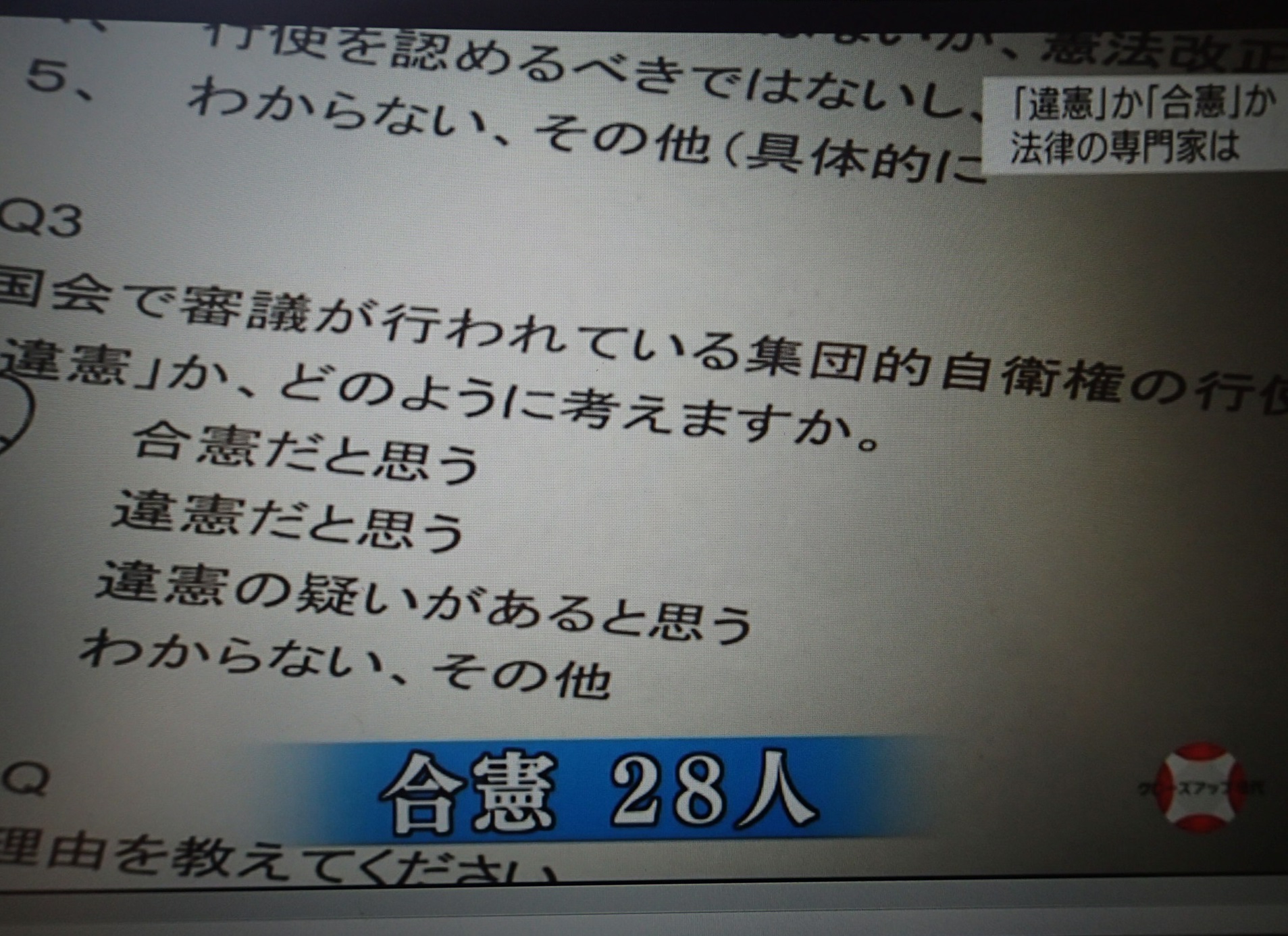 わずか26分の番組のなかで、憲法研究者のアンケートについては2分だけで、残りは法案に賛成と反対の立場の人を、賛成3人と反対2人というアンバランスで、それぞれ意見を言わせていた。そのなかで、賛成論のアーミテージ氏(元国務副長官)・北岡伸一氏(安保法制懇座長代理・政治学)・齋藤隆氏(元統合幕僚長)に長く語らせ、強行採決でイメージダウンした法案を「復権」させるような流れにしていた。反対論には大森政輔氏(元内閣法制局長官)と柳澤協二氏(元内閣官房副長官補)に加えて少なくともあと1人必要ではなかったか。防衛省記者クラブの政治部(政権部?)記者が、合憲・違憲の議論を軽く扱おうとしたのに対して、国谷キャスターは「合憲か違憲かというのは非常に根本的で本質的な問題だけに、参議院でもこの点が議論の焦点にならざるをえないのではないでしょうか」とピシャリと述べたのが印象的だった。政府寄りの「安全保障環境」云々の問題にもっていこうという番組の流れのなかで、キラリと光る一瞬だった。
