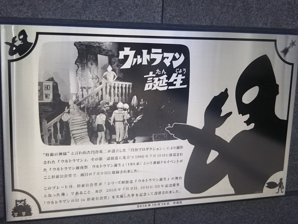 先の「ウルトラマン誕生」という看板の写真は、1966年7月9日、杉並公会堂において、「ウルトラマン前夜祭 ウルトラマン誕生」(TBS)の番組収録が行われたことを記念して作られたもの。たまたま4日に早稲田大学フィルハーモニー管弦楽団の第76回定期演奏会があり、その際、入口近くの壁にプレートがあるのを見つけて撮影した。杉並公会堂がその意味で、「ウルトラマン誕生の地」ということになるようだ。