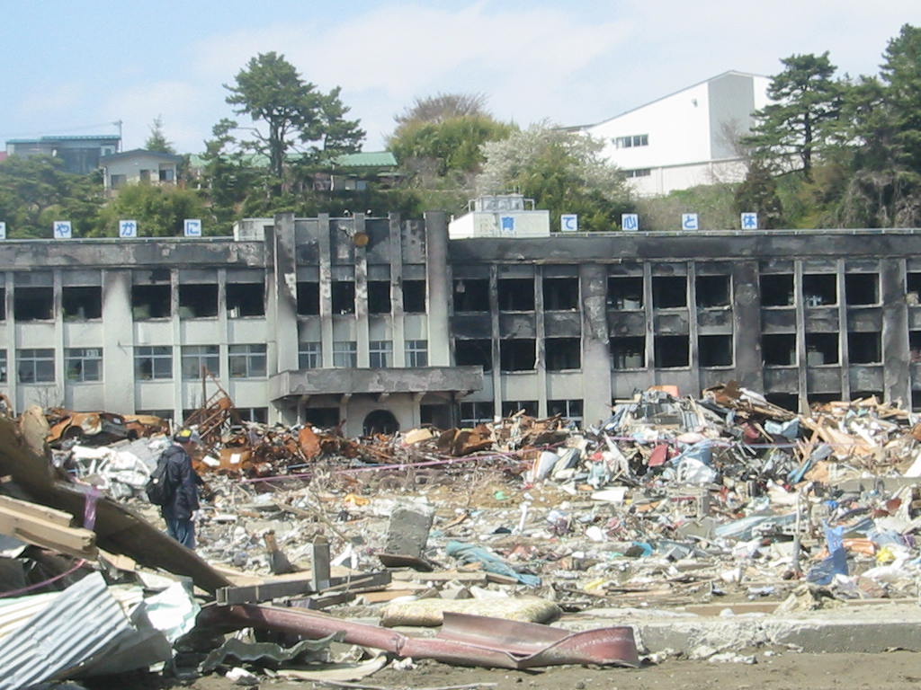 震災後の「直言」で、「想定外」という言葉を批判するとともに、被災地の現場を直接取材して書こうと決意し、2011年4月下旬、まずは福島県郡山経由で南相馬市に入った(直言「大震災の現場を行く(1)」)。どこでも、あまりの惨状に言葉を失った。左の写真は、震災1カ月後の石巻市立門脇小学校である。火災で黒く焼け焦げた校舎。「すこやかに育て心と体」という看板が焼け残っていた(「大震災の現場を行く(2)」)。その10カ月後、津波で74人の児童が命を失う悲劇が起きた石巻市立大川小学校に向かう途中、再び門脇小を訪れたときが右の写真である。瓦礫の撤去も進み、黒ずんだ壁面が削られていた。そして、2013年7月に再度訪れたときは全面にネットがはられて見えなくなり、震災遺構として一部が保存されるという)。