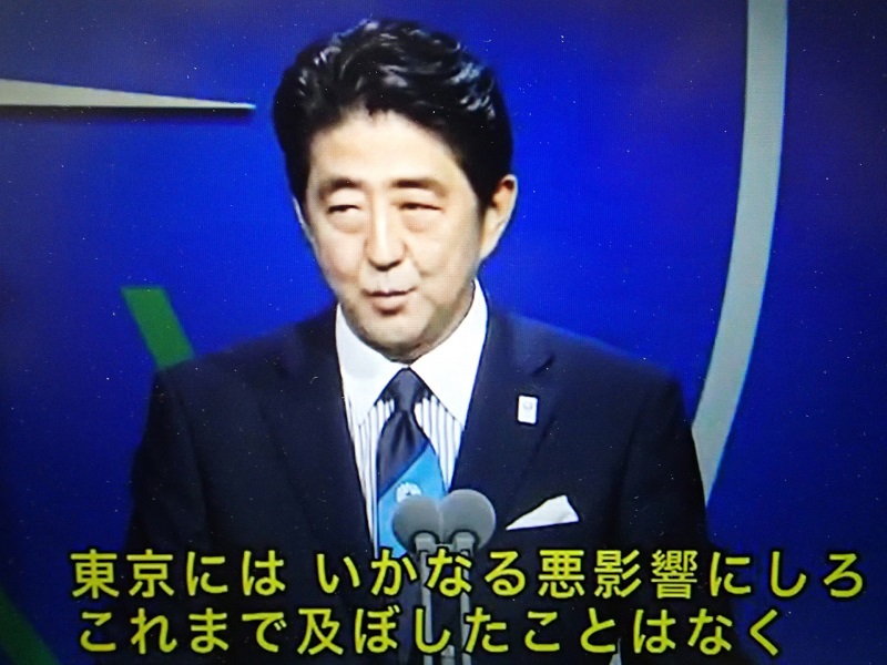 意気揚々と演説を進めていくが、「フクシマ」という言葉を使う瞬間、舌を少しなめて表情を曇らせ、「いかなる悪影響」というところは妙に目が座った印象である。「私から皆さんに保証いたします」と胸をはる。こんな大嘘を世界に向かって堂々とできるところが、安倍首相の「無知の無知の突破力」のなせる技か、とここでも思う。