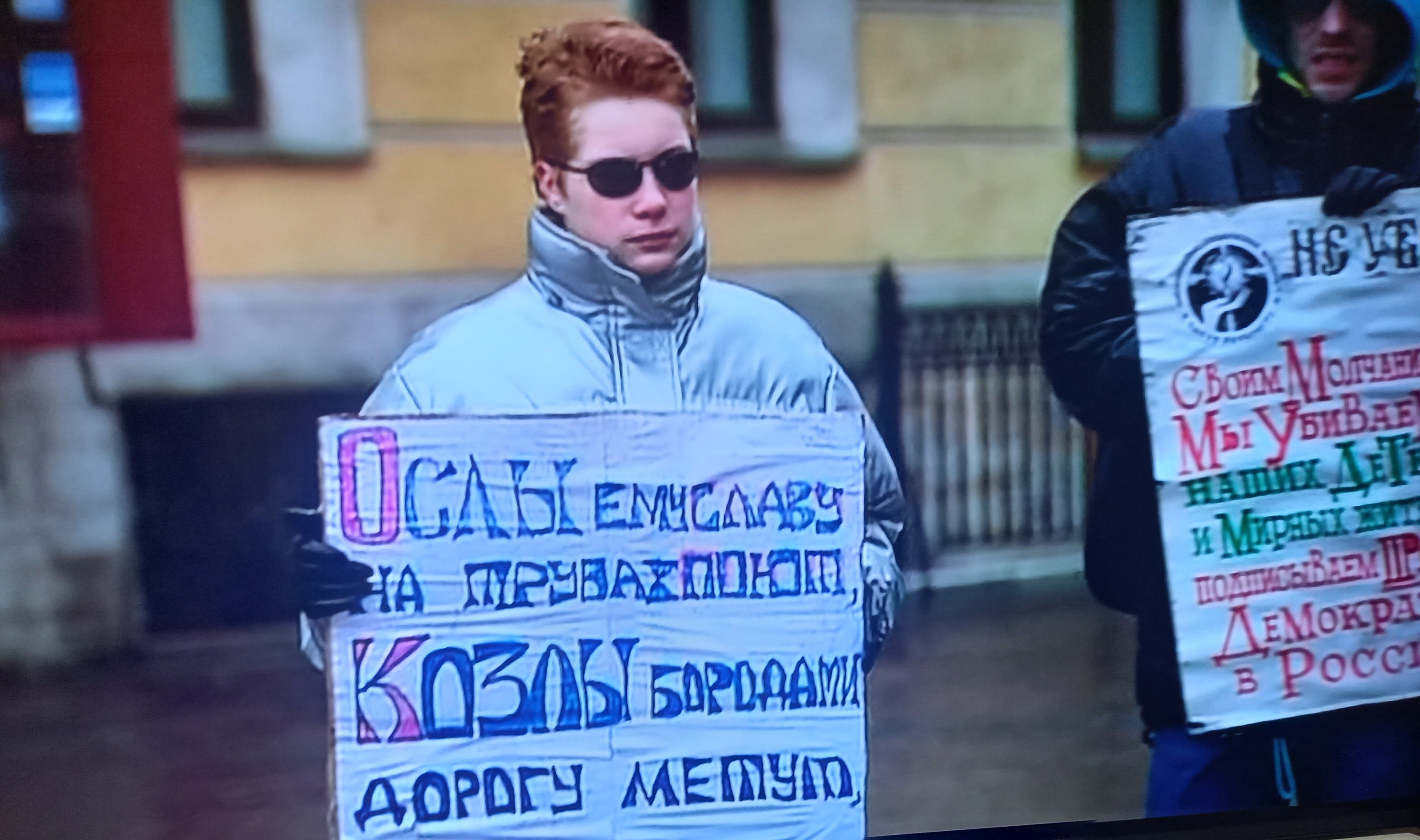 エリツィン政権の頃は、街頭におけるプラカードを掲げる行為には、警察の規制はあるものの、質問をしたり、パトカーから監視を続けるくらいで、現在のプーチン政権のように、プラカードをもぎとったり、すぐに逮捕ということはなかった。ロシアにまだ表現の自由が残っていた時代の話である。