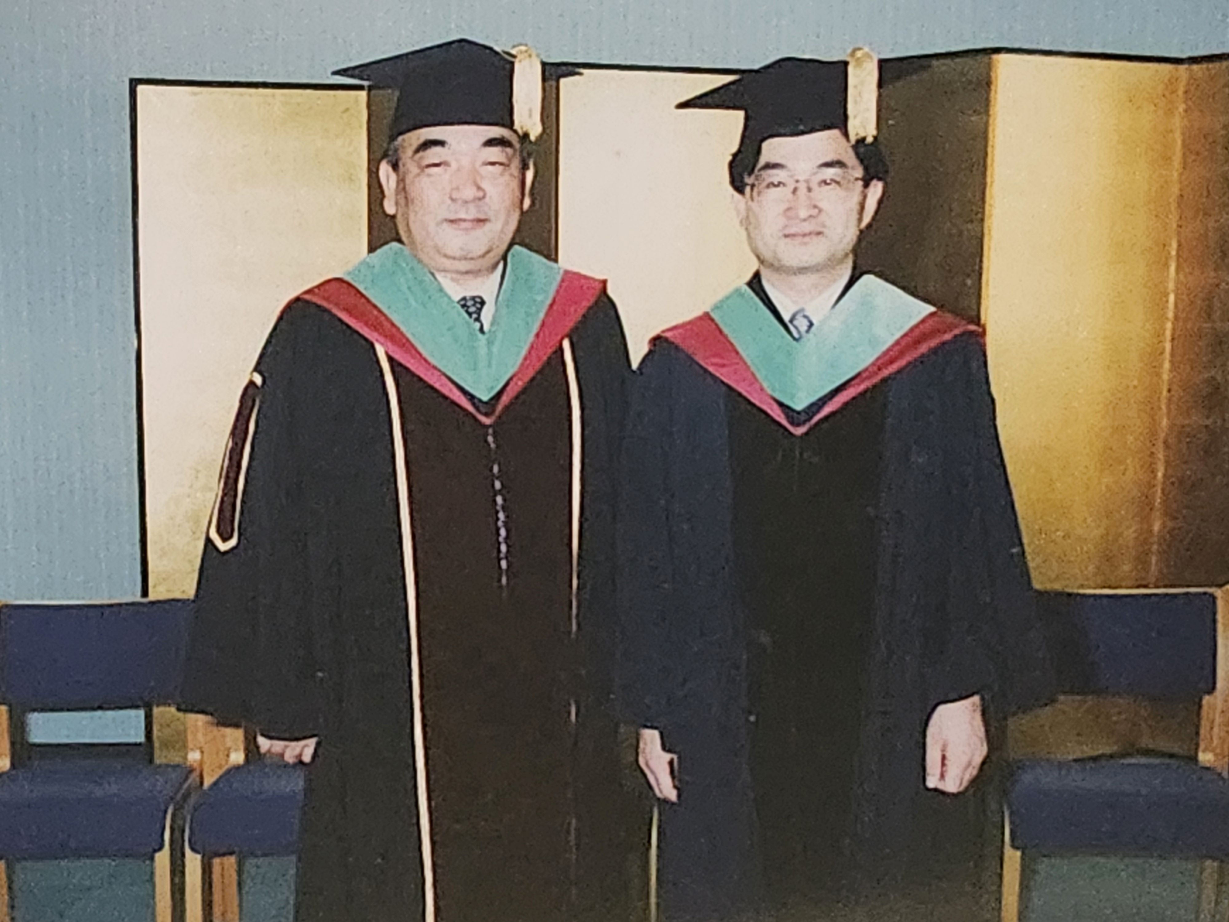 冒頭左の写真は、1998年4月2日、大隈講堂で行われた大学院入学式で祝辞を行った際、控室で撮影した写真である。前年に私は博士(法学、早稲田大学)の学位を授与されていたので、初めてアカデミックガウンを着て、学位章(フード)を付けた。早大では、博士(法学)が黄緑色、文学が銀灰色、理学が黄色等々、学位の種類は色で区別されている。笑っているが、緊張していた。当時、私は早大教授3年目の44歳。法学研究科委員長(当時)の宮坂富之助教授(故人)からは、「水島君、入学式の祝辞が法学研究科にまわってきた。これは宝くじにあたるよりすごいことなんだよ。しっかりやりなさい」といわれていた。年に1度の入学式で、多数ある研究科から1人だけ推薦されて祝辞を行う。いやがおうでも緊張する。宮坂教授は、「つまらない挨拶をしたら僕が承知しないよ」とプレッシャーをかけてきた。それでふっきれた。新入生に思い切って語りかけようと。それがこれである(「大学院入学式での祝辞」早稲田大学広報旬刊・Campus Now 2602 号〔1998年7月15日〕)。このなかで、「学問の旅」ということを話した。