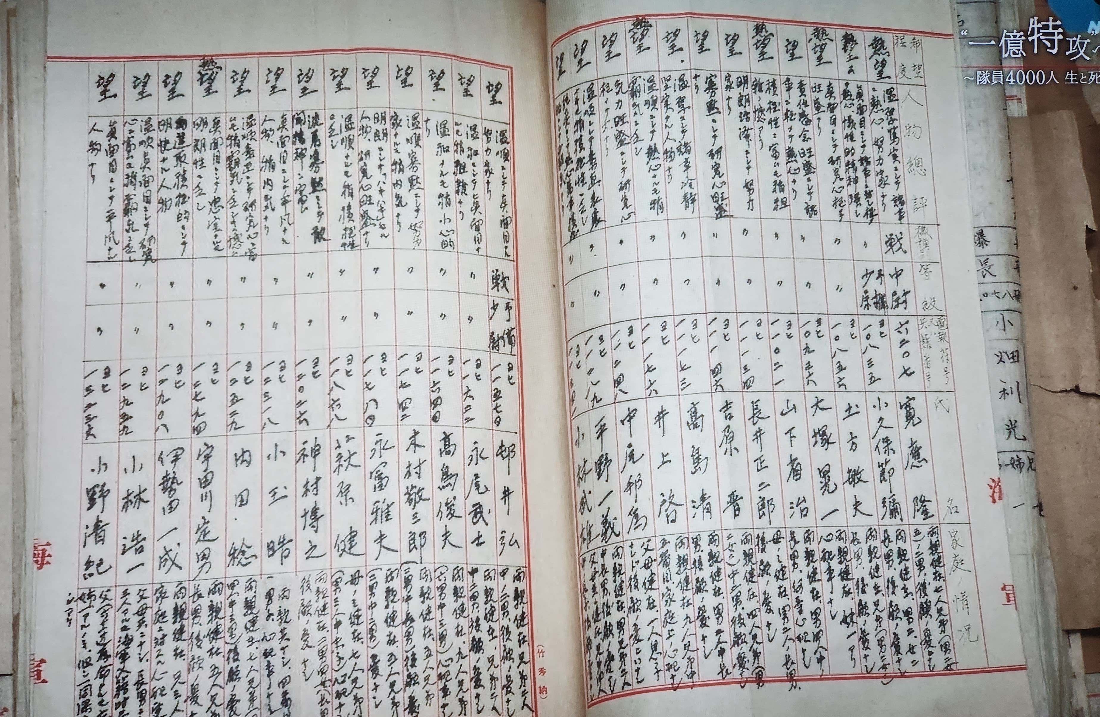 この作品でもう一つ注目されるのは、特攻隊員をどうやって選別していたのかについて、極秘の一次資料を発掘して明らかにした点である。全国55の航空隊が、国内で訓練する搭乗員に特攻志願の意向調査をして、それを海軍省人事局に提出した2132人分の極秘資料。成績順に並んだ隊員リストの最上段には、志願の程度を示す「熱望」と「望」の文字が並ぶ。志願だから「否」もありだが、一つもない。そこに名前のある生存者に取材したところ、「否」の気持ちでも「望」としたという。だが、実際の選定基準は成績だった。「熱望」と書いても成績上位者は選ばれなかった。結局、何事も成績だった。「最優秀な隊員を一回の特攻で死なせるのはもったいない」という、軍上層部の判断が介在していたのである。志願の形をとった死の強制だったが、消耗戦に使う命を選別する冷徹な判断も介在していたのである。