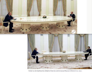 思えば、プーチンもまた、自分の好まない相手は徹底的にいじめる傾きにある。例えば、2022年2月14日、ウクライナ侵攻の10日前にフランスのマクロン仏大統領がプーチンと会談した時は、この写真にあるような机の配置をとった。翌15日のショルツ独首相との会談の際にも、いじわるをした。信じられない長い机の端っこに座らせ、明らかに「聞く耳持たぬ」のパフォーマンスである(直言「ウクライナをめぐる「瀬戸際・寸止め」手法の危うさ―悲劇のスパイラル」)。「侮辱外交」もまた、プーチンのお手の物である。これに対して、安倍晋三は御しやすいとみて、27回もの首脳会談に応じて、徹頭徹尾利用し尽くしている(直言「「外交の安倍」は「国難」―プーチンとトランプの玩具」参照)。トランプもプーチンも、ともに絶対君主のようなメンタリティをもっている。そのことをしっかり踏まえるべきだろう。