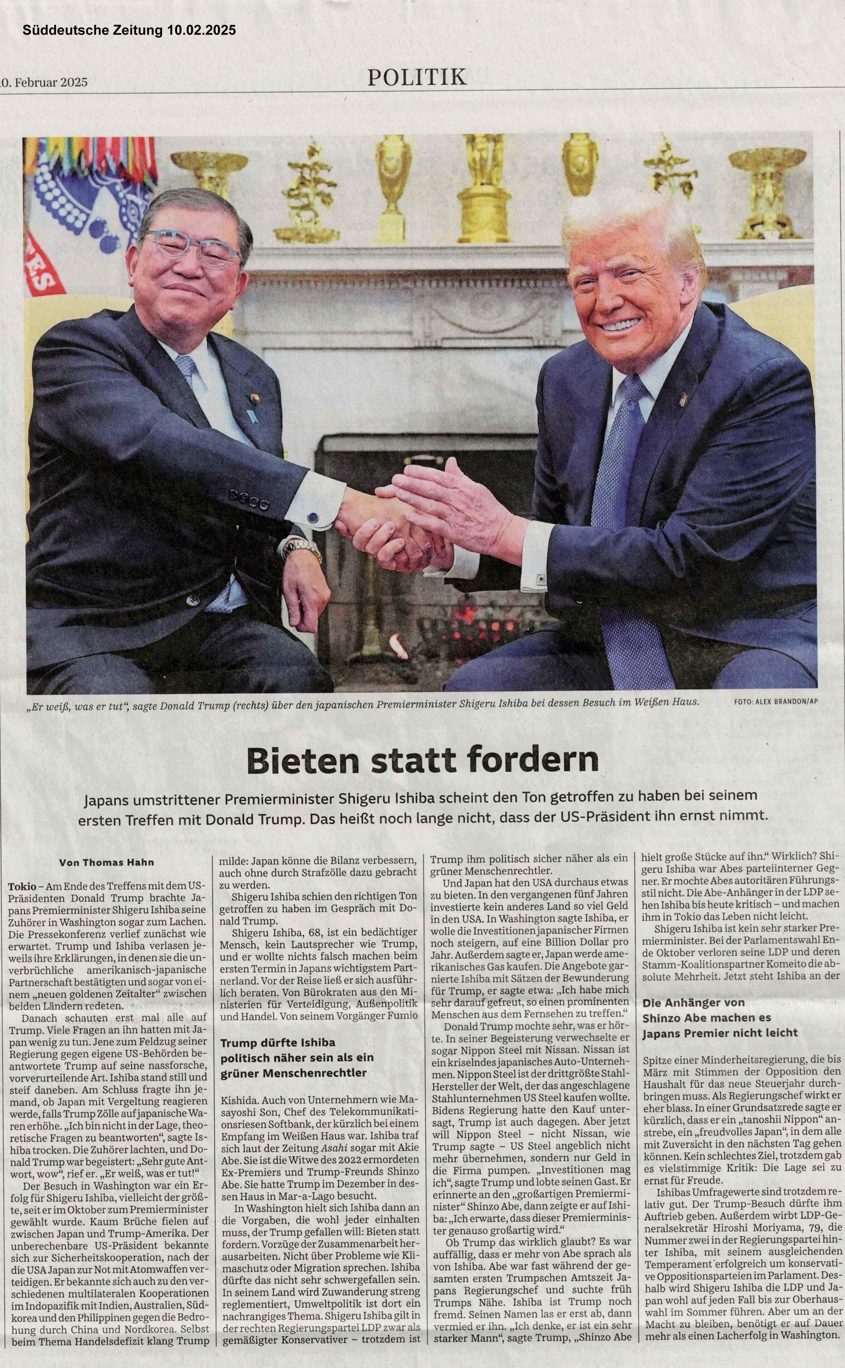 冒頭の写真は、2月8日(日本時間)の日米首脳会談を扱った『南ドイツ新聞』2月10日付記事の切り抜きである。「要望する代わりに申し出る」という見出しで、「石破はワシントンで、トランプを喜ばせたい人が必ず守るべきガイドラインに従った。 協力の利点を強調する。気候保護や移民といった問題を口にしない…」とある。トランプは日本と関係ないことをまくしたて、それを「石破は静かに、固まって傍観していた」と。最後に記者が、「日本製品への関税を引き上げた場合、日本は報復措置をとるのか」と質問したところ、石破は「仮定のご質問にはお答えできません」と返し、会場は笑いに包まれ、トランプは大喜びだった。「彼は自分が何をしているのかわかっている!」と。この記事を読めば、ドイツの読者は、日本の首相がトランプにいいようにあしらわれているという印象を持つだろう。