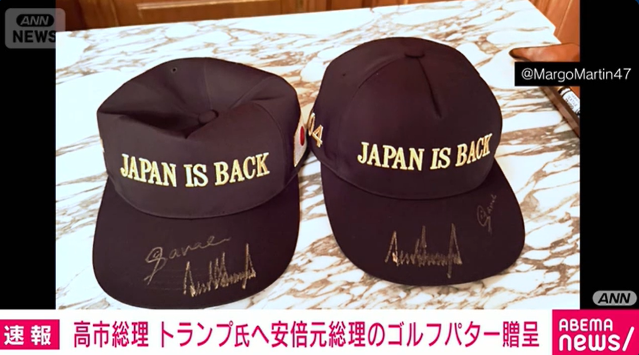 ここで思い出すのが、その下の写真である。「師匠」の安倍晋三が、2017年11月のトランプ初来日の際に送った白いキャップ。そこには、“MAKE ALLIANCE EVEN GREATER”(「同盟をさらに強固にせよ」)とあった。今回入手したものは、“JAPAN IS BACK”(「日本は戻ってきた」)である。映画『ターミネーター』(1984年)で有名な“I'll be back”のノリで、「日本は戻ってくる」なら“JAPAN'LL BE BACK”なのだろうが、どうも意味不明である。もともと“JAPAN IS BACK”は、安倍が2013年の世界経済フォーラム(ダボス会議)で発したスローガンであった。「失われた20年」を経て、日本が再び国際舞台で積極的な役割を果たすという宣言だった。高市が「日本は戻ってきた」というのなら、これまでの自民党政権は「失われた13年」だったということなのだろうか。